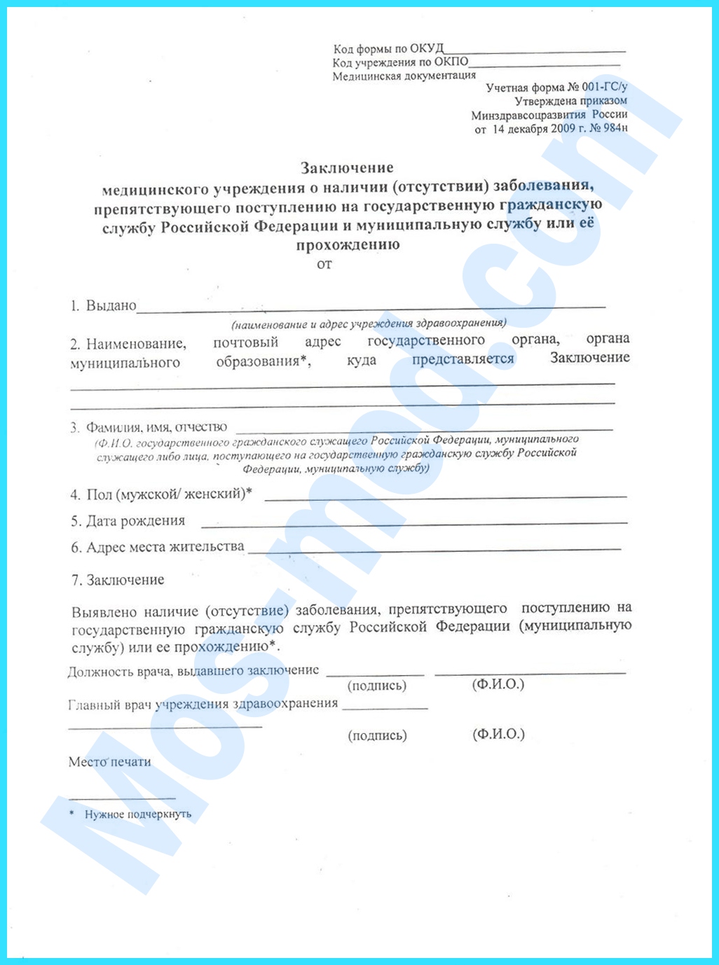 При трудоустройстве в государственные ведомства претендент, помимо прохождения стандартного медосмотра, обязан предъявить справку 001 ГС/у. Обычно на её оформление требуется довольно много времени, ввиду чего перспективная должность может быть занята другим соискателем. Документ оформляется на официальном бланке по ГОСТ с подписями врачей и печатями медицинского учреждения.
